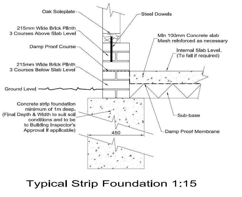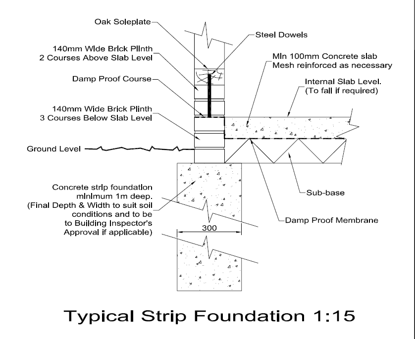 Strip foundations are continuous trenches filled with concrete, designed to support a wall rather than a single point. There should be a minimum of 75mm of footing showing on each side of the wall that sits on it. This is the most common type used in oak-framed buildings, and provides a reliable base for load-bearing walls.