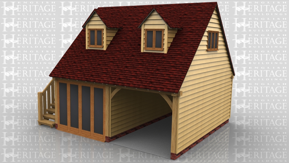 This two storey oak framed garage has two bays; one open and one enclosed. The first floor is accessed via an external oak staircase to the left hand side and a half glazed door. The enclosed bay has full length opening garden room windows to the front. On the first floor there are two dormers to the front, each with a two pane window, and a three pane window to the left side.