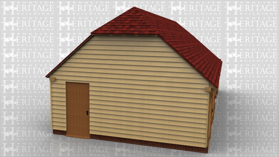 This oak framed four bay garage has two enclosed bays with garage doors and two bays open at the front. It has barn hip roof ends and a catslide on the right hand end.
