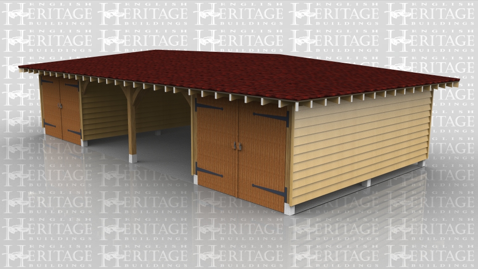 This oak framed garage has a very shallow roof pitch and Zinc roof covering. There is no plinth wall and all the posts sit on staddle stones. The centre two bays are open fronted and the outside two are enclosed with garage doors
