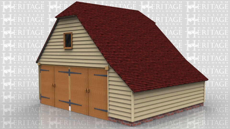 This oak framed two bay, two storey garage has two solid garage doors to one side and full length windows to the other. The first floor is used for storage and can be accessed via a hatch in the building. There are two single pane windows on the first floor and two mullion windows at the front of the building. There is an enclosed store to the right hand side.