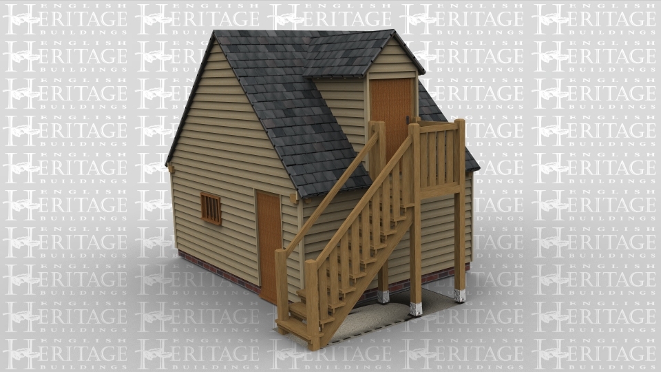 A single bay oak framed garage with an upper floor . The ground floor has an iroko garage door at the front, on the right there is a mullion window and a solid single door, at the rear is an external staircase leading to the first floor. The first floor has a dormer containing a solid single door and a slate roof